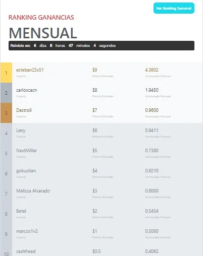 Actualmente el ranking semanal y mensual reparte $10 al primer lugar. Estos valores con el tiempo se pueden ir modificando. Lo bueno es que ésto se ha implementado hace poco, y para quedar en los primeros puestos, no se necesita obtener muchas ganancias, así que hay que aprovecharlo. Además, si son premium, ganan el doble por lo que hes mas fácil obtener premios en estos ranking.